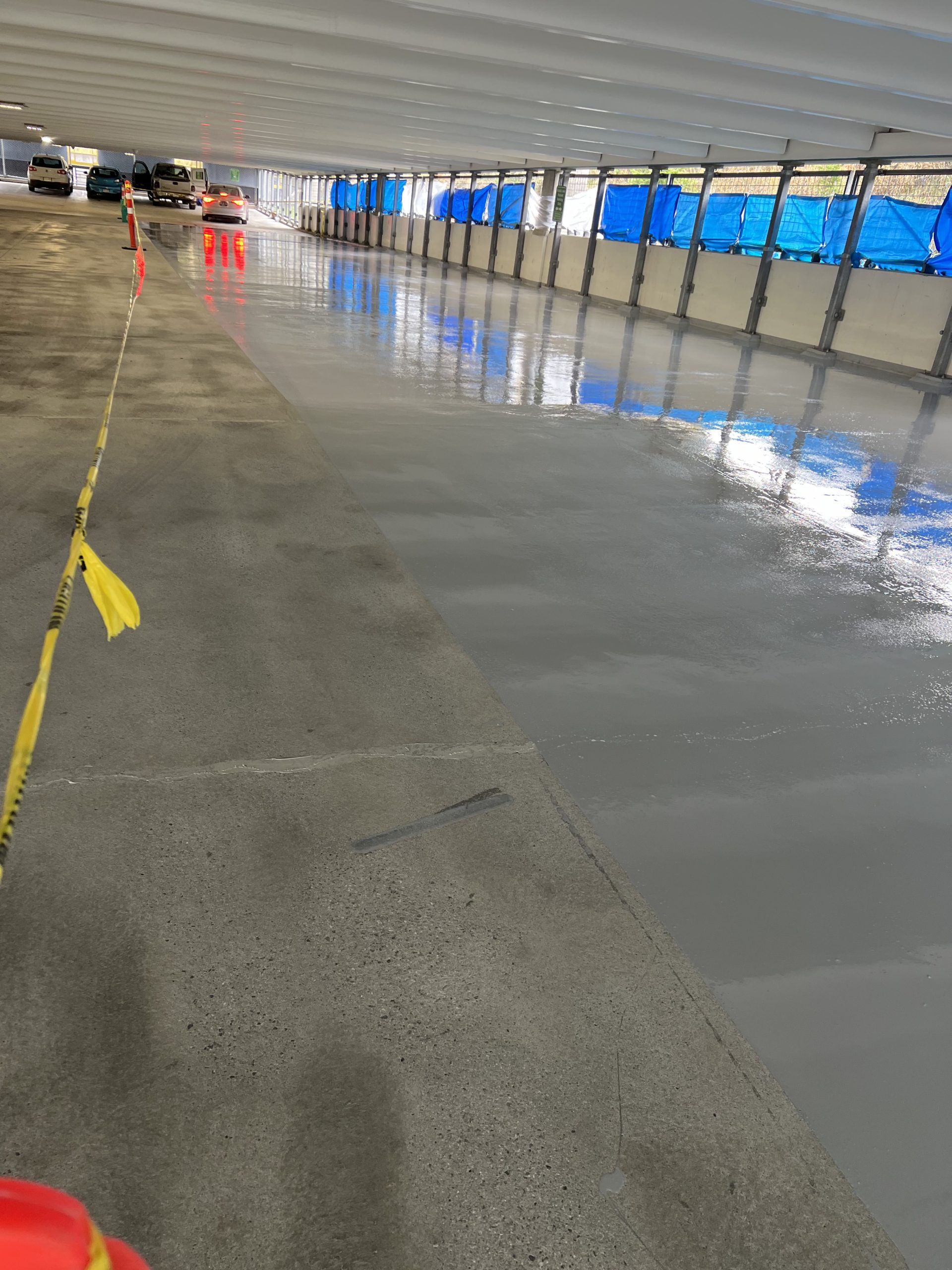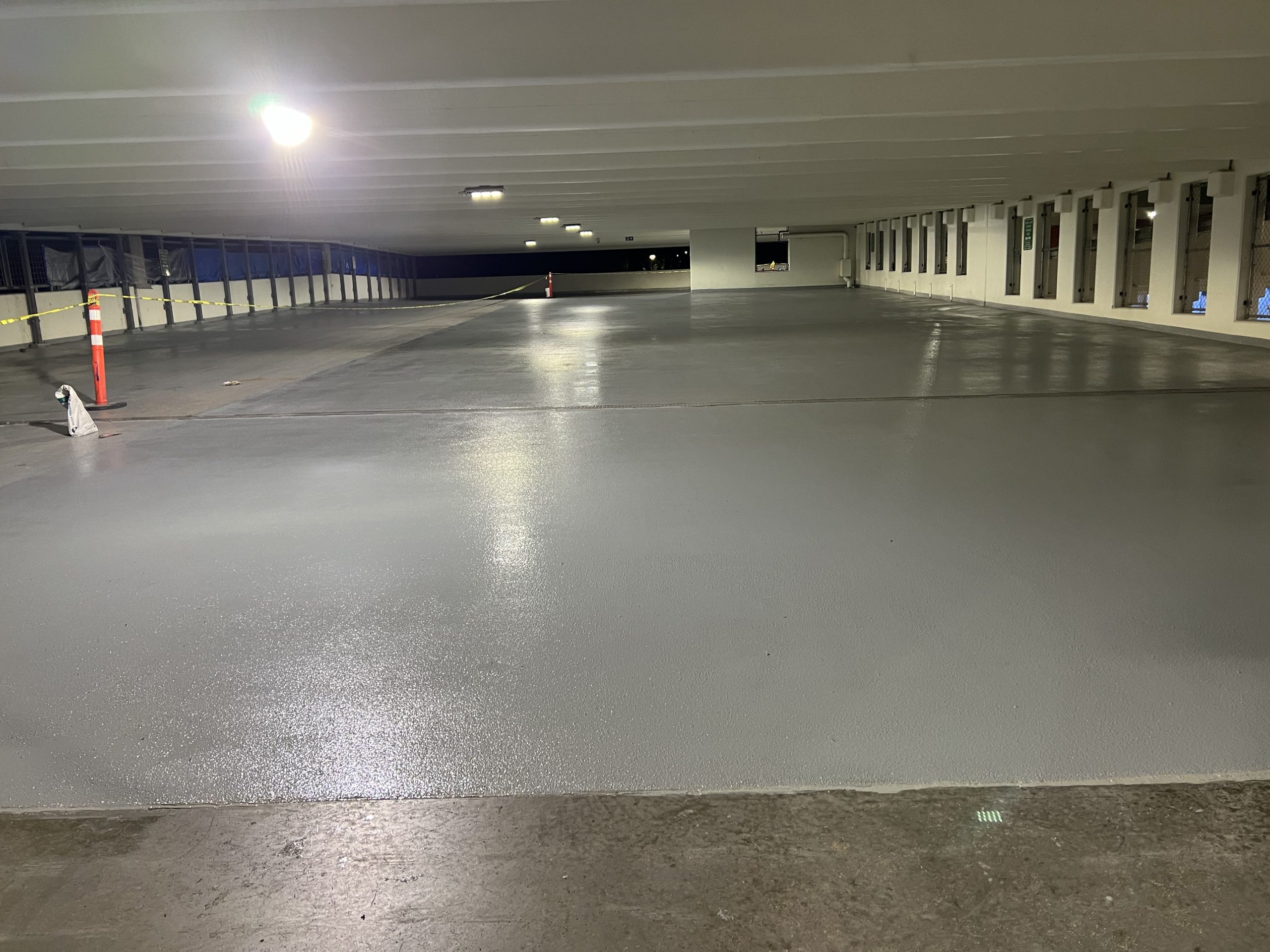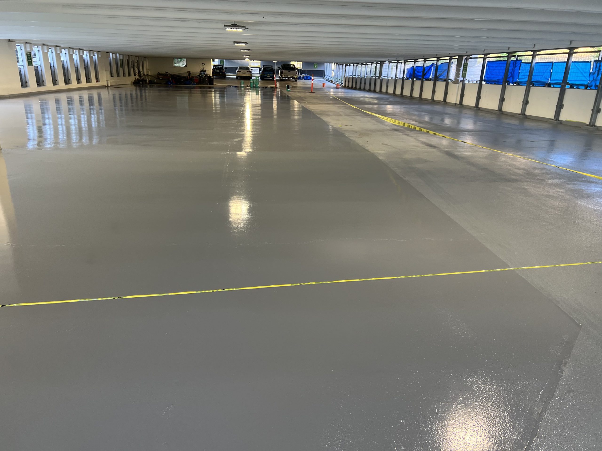 This large-scale project included restoring heavily worn areas, resurfacing drive lanes, and applying a high-performance, slip-resistant coating throughout the parkade.
