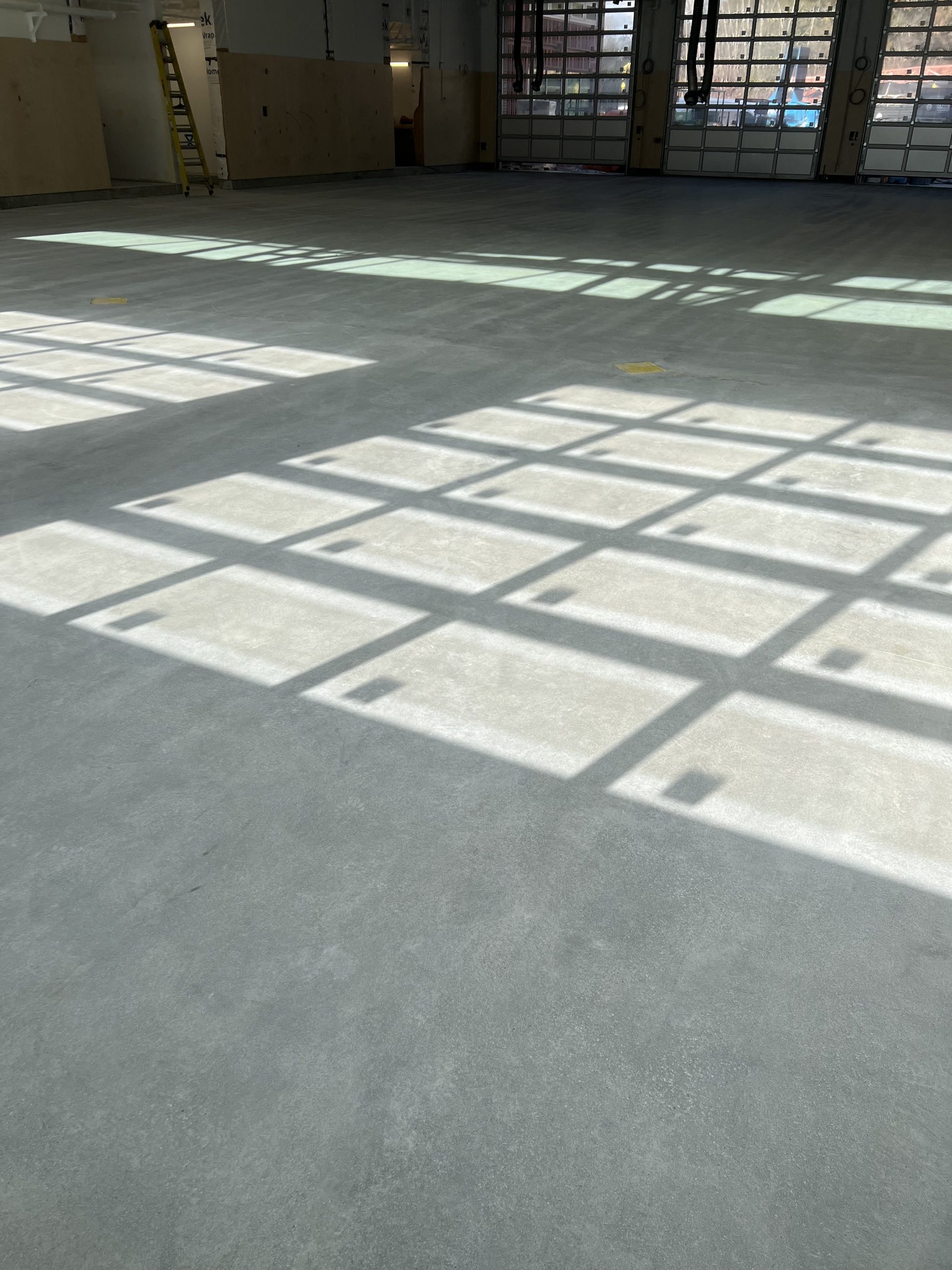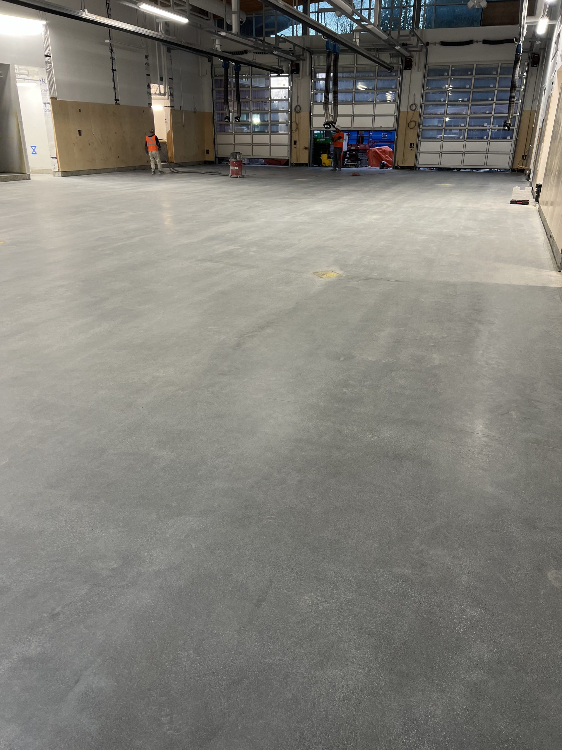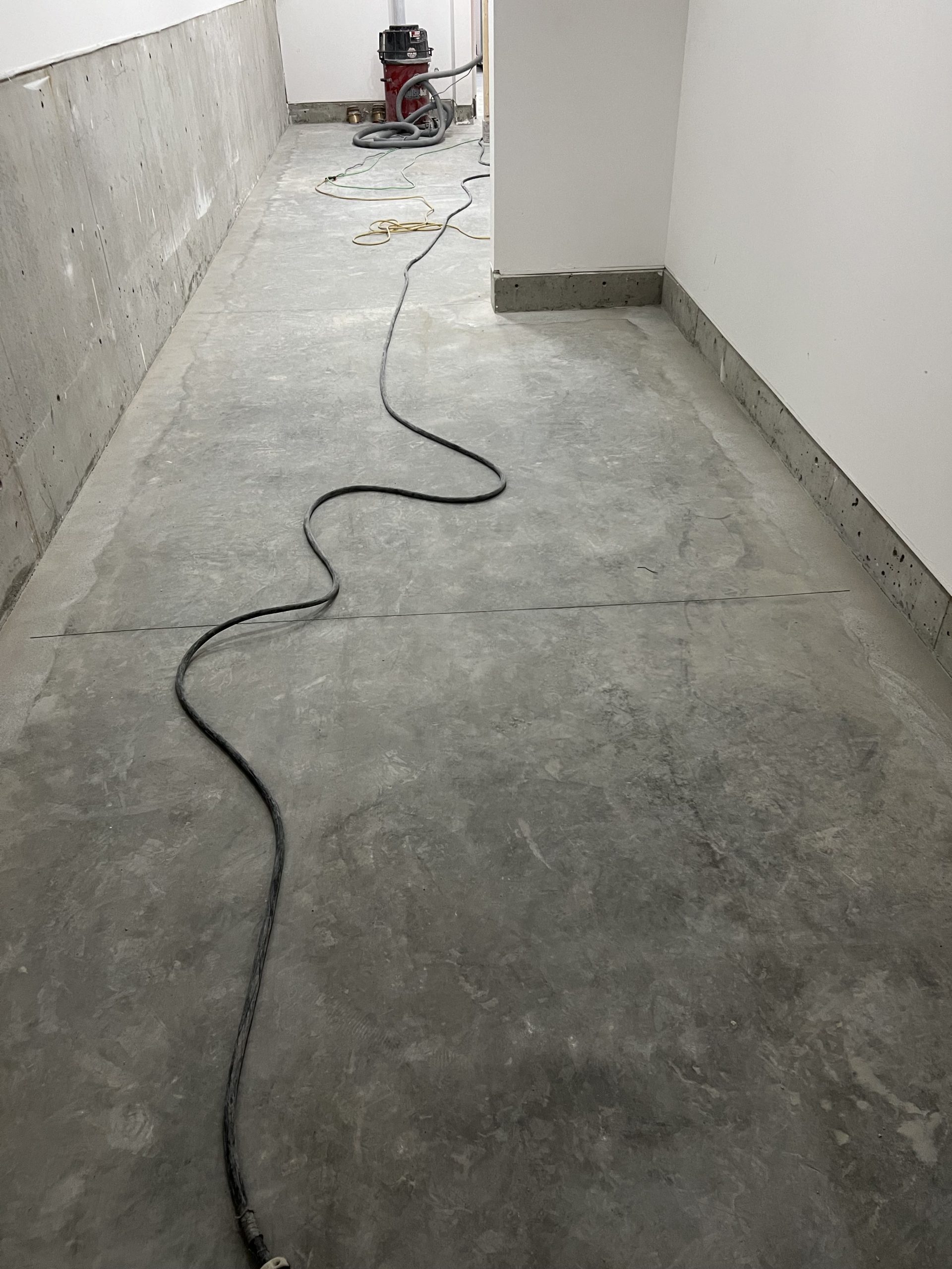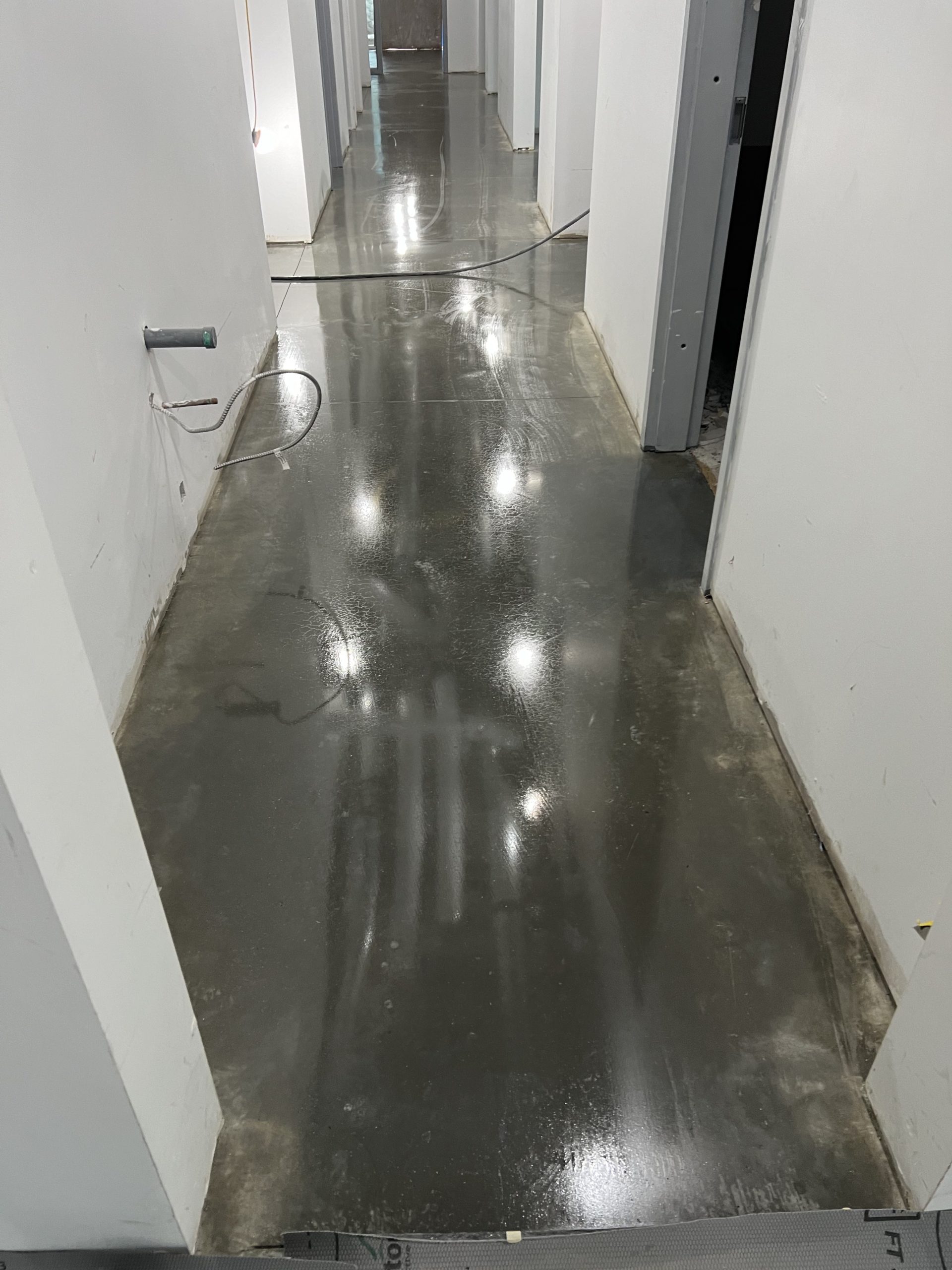 The finished floors feature a smooth, refined concrete look with a consistent sheen that improves light reflectivity throughout corridors, rooms, and operational areas. Expansion joints were carefully respected, and edge details were finished cleanly to ensure a seamless transition along walls, doorways, and structural elements.