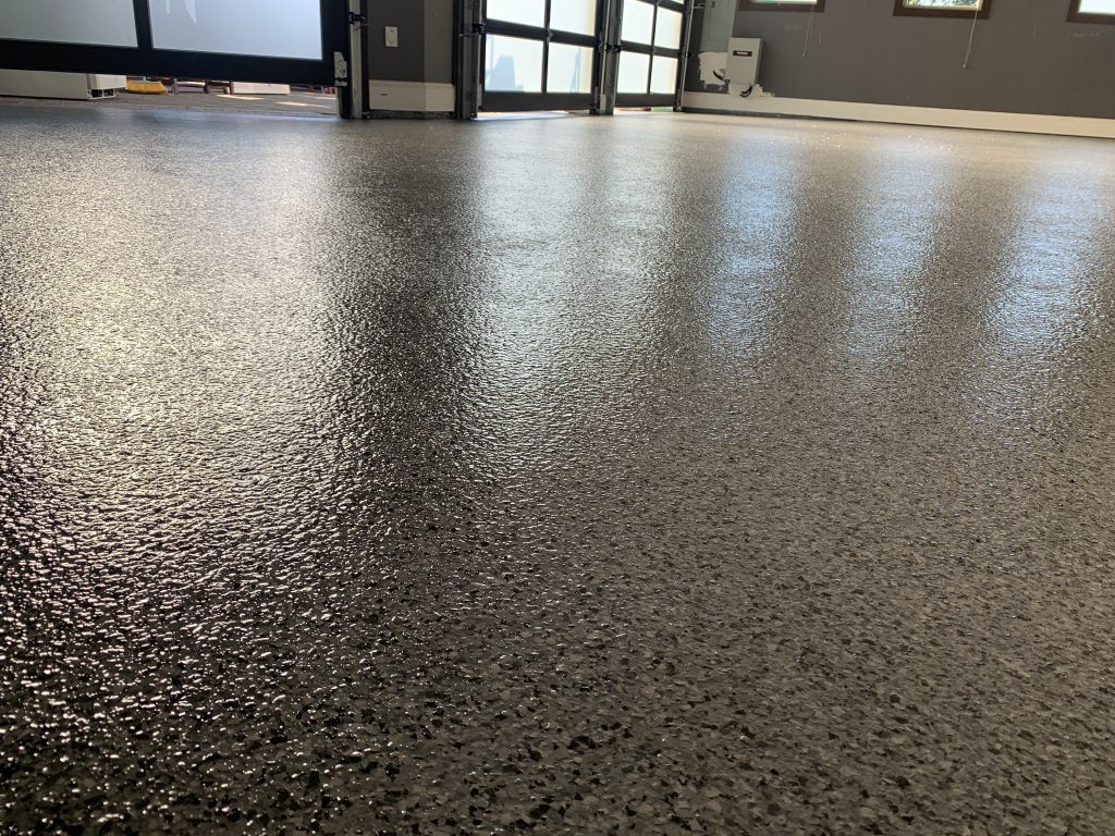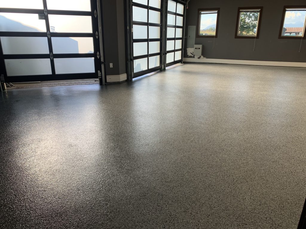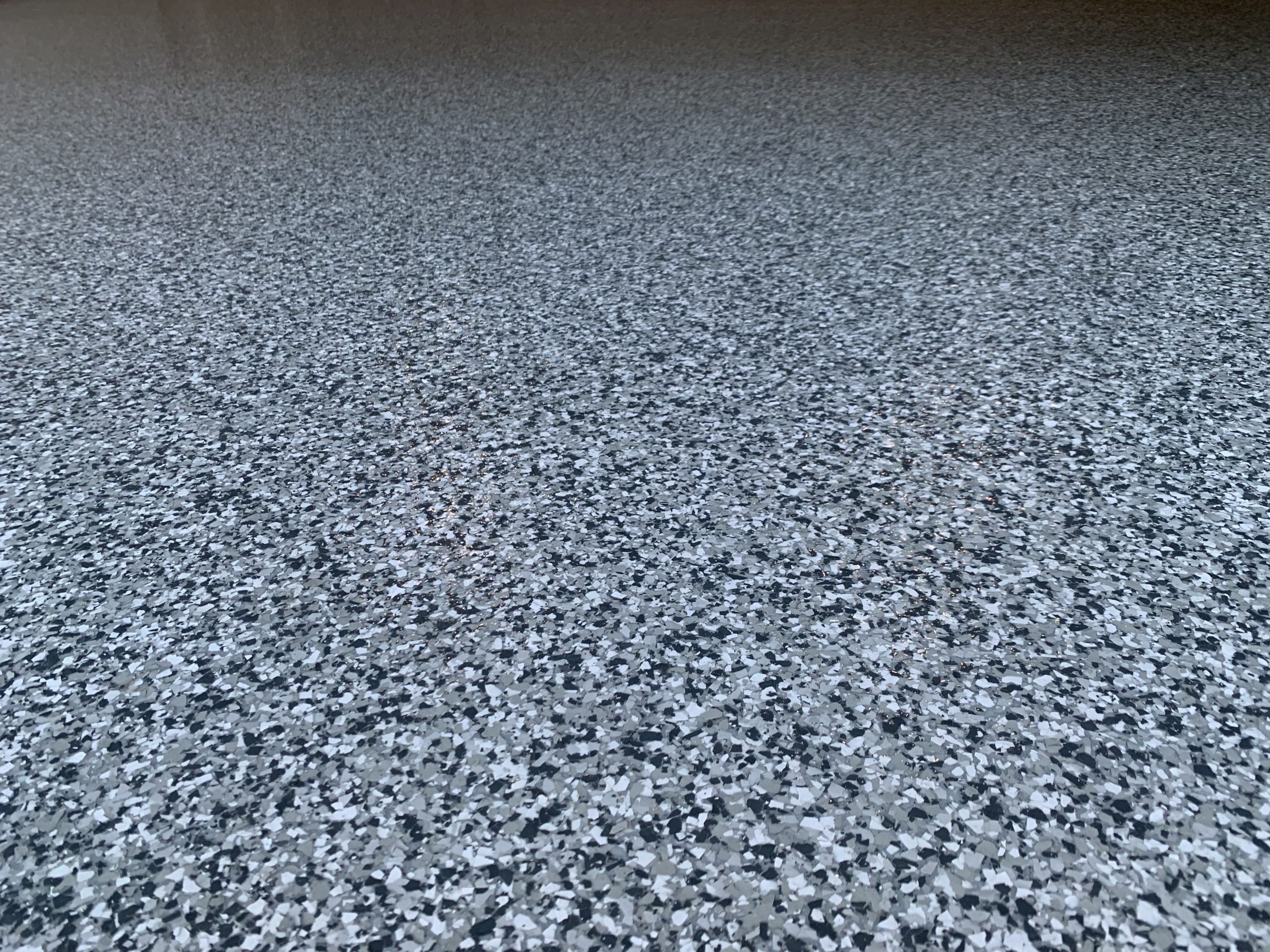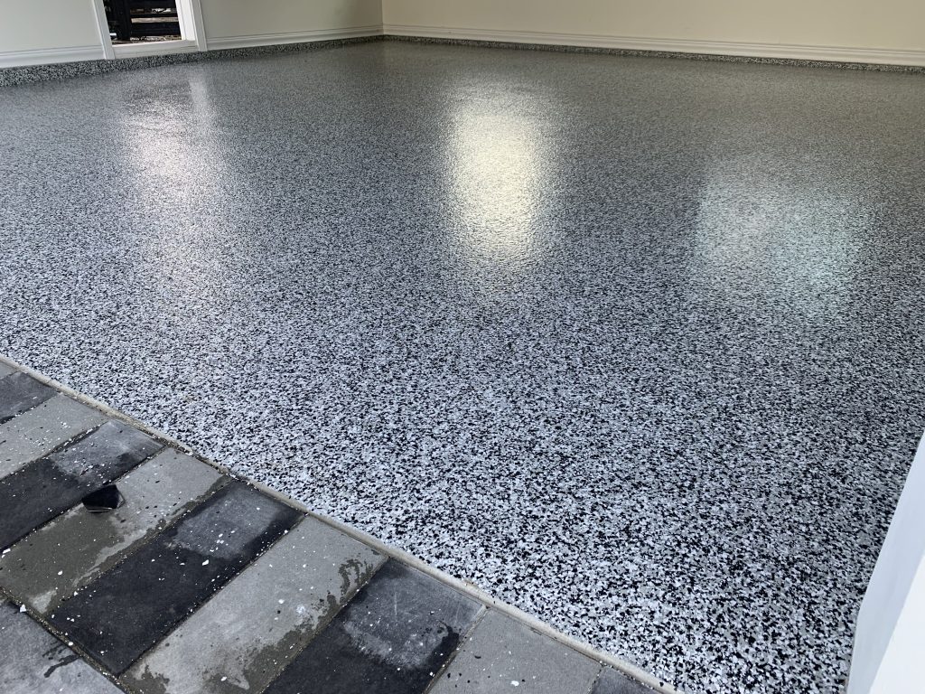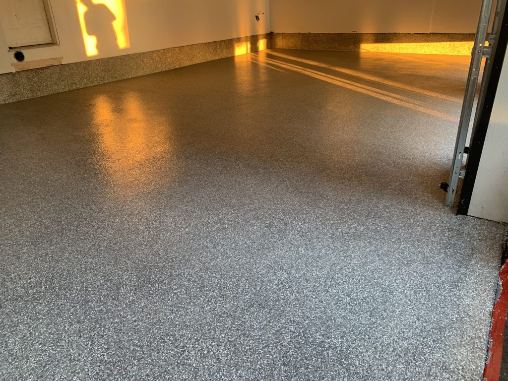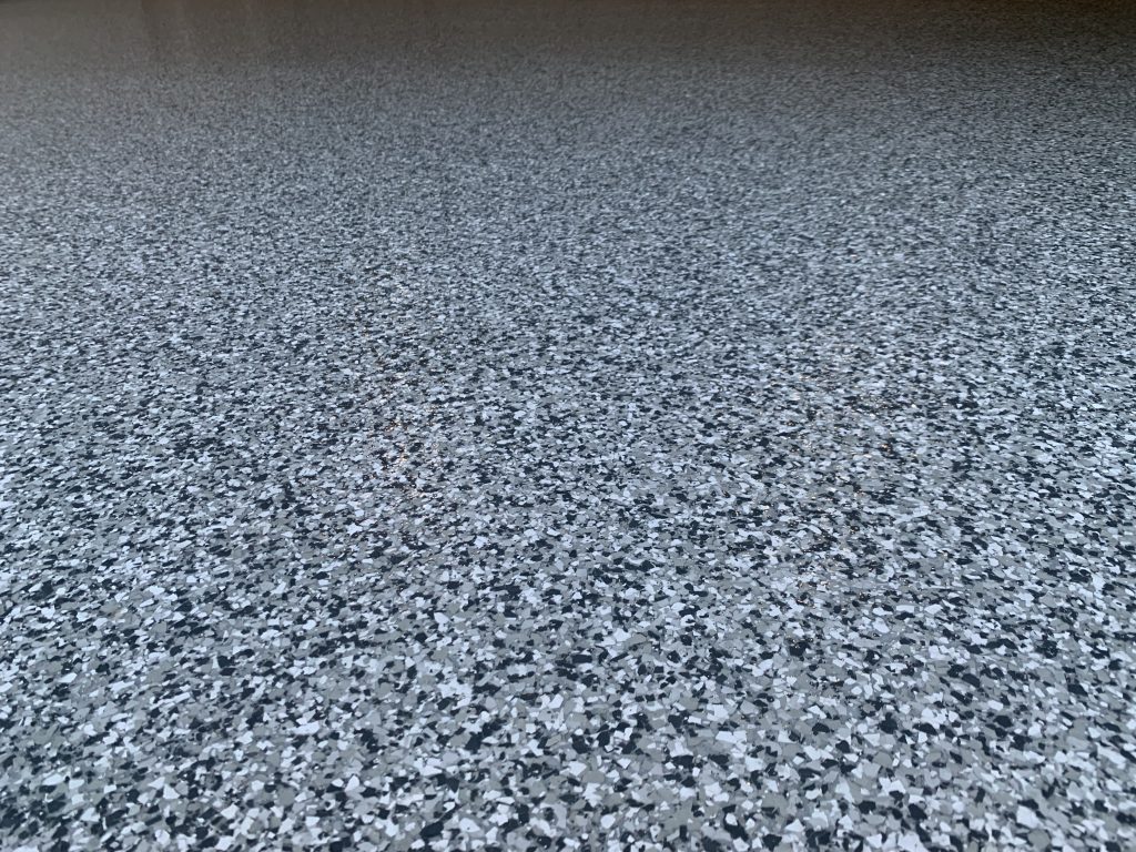 The completed floor delivers a clean, slip-resistant, and highly durable finish that elevates the overall space. This flake broadcast system offers an ideal balance of function and design, making it a reliable and visually appealing flooring solution for residential environments.