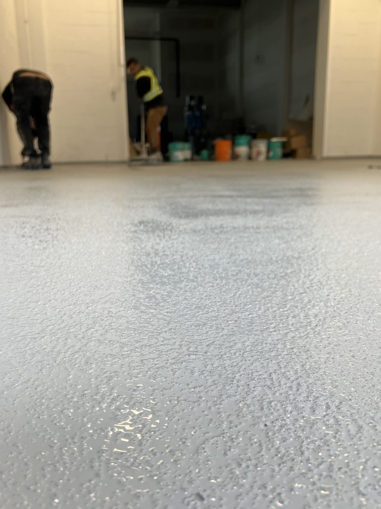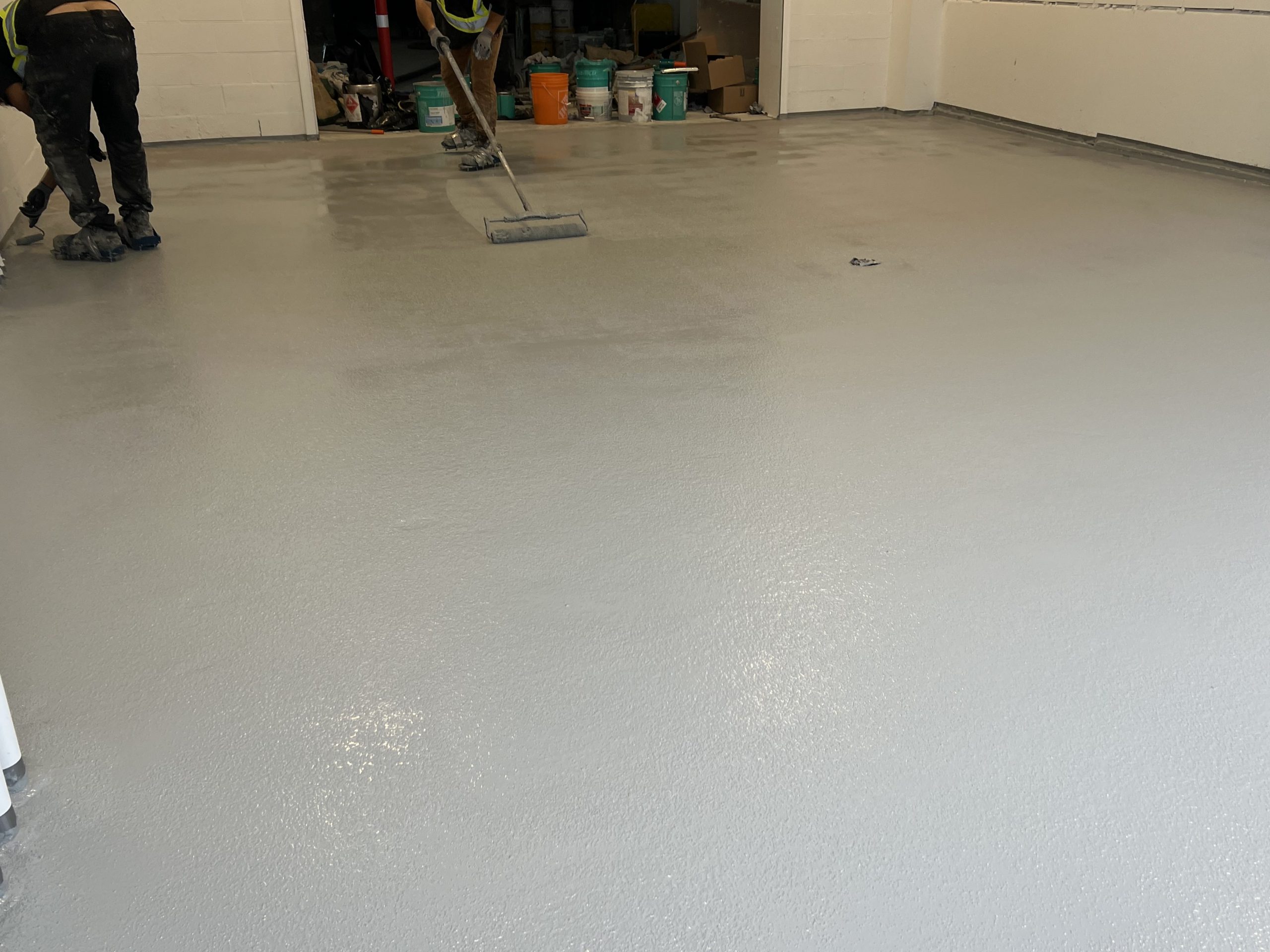 Work began with thorough surface preparation, including mechanical grinding to remove contaminants and open the concrete for proper adhesion. Attention was given to edges, walls, and transitions to ensure full coverage and long-term performance. Once prepared, a commercial-grade epoxy coating was applied evenly across the floor to create a seamless and protective surface.