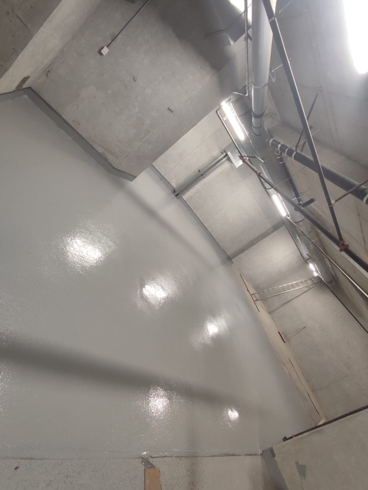The finished coating provides excellent resistance to abrasion, moisture, and chemical exposure while improving visibility through its light-reflective finish. The textured surface enhances safety by reducing slip hazards, particularly in areas exposed to water or spills during daily operations.