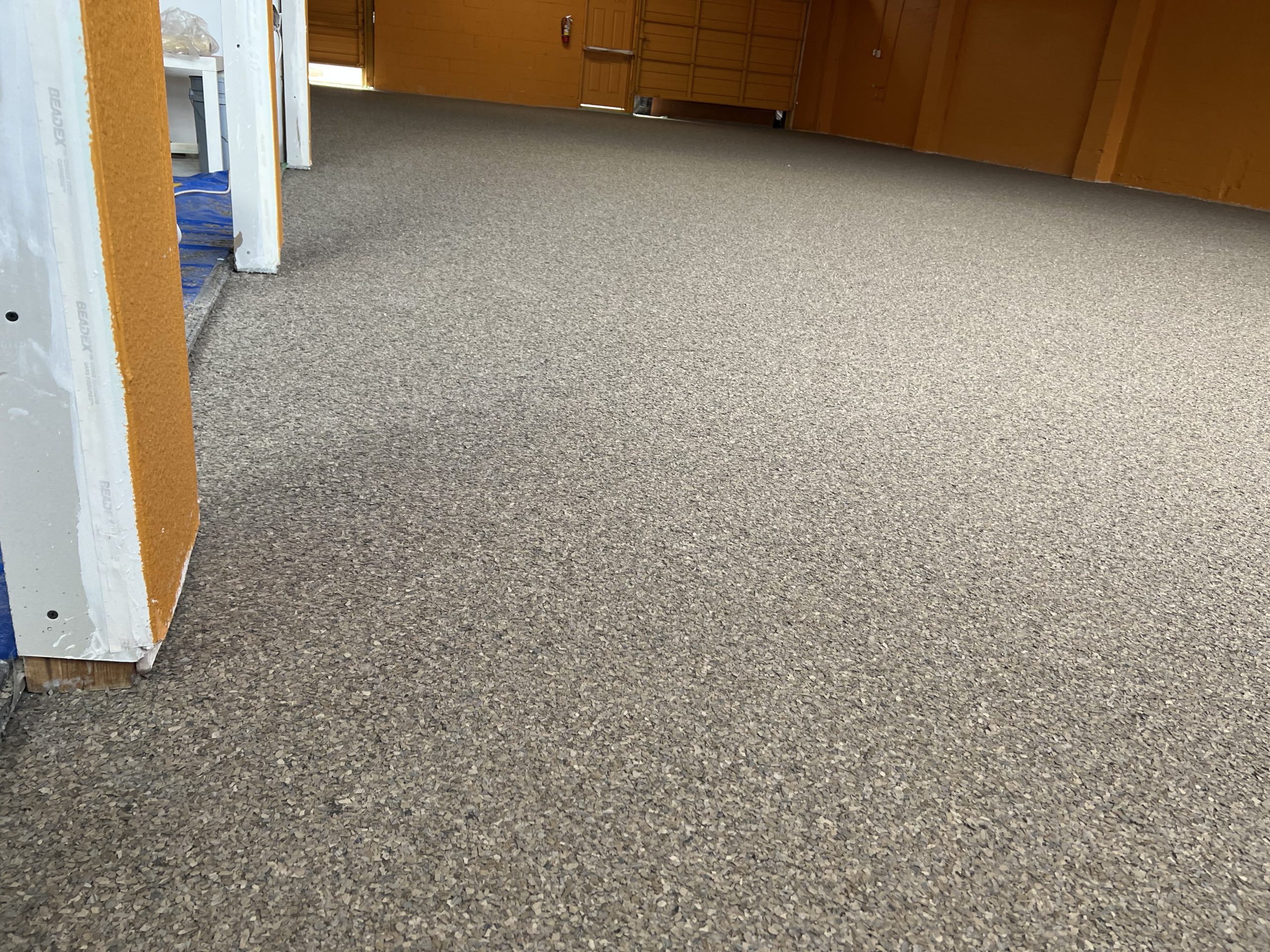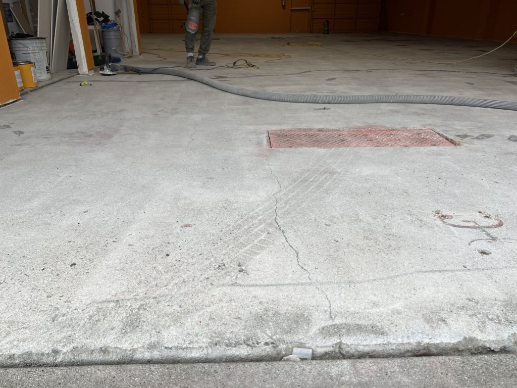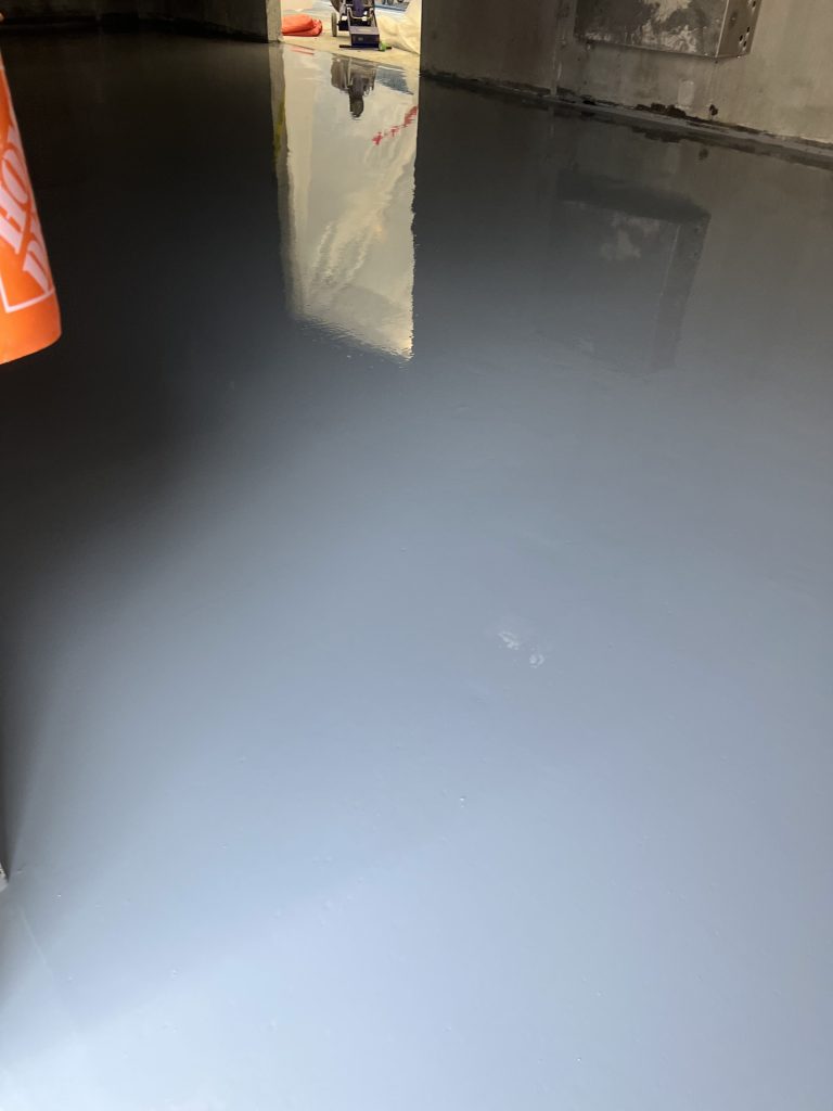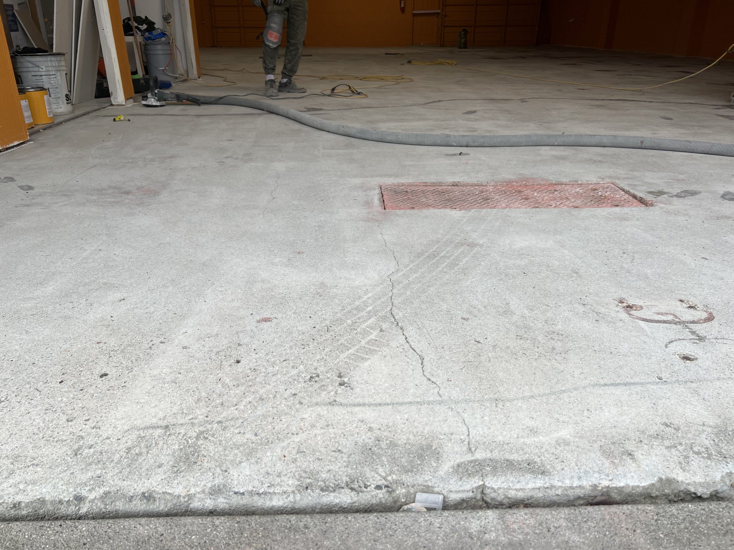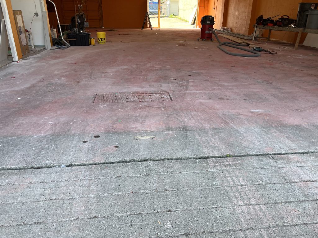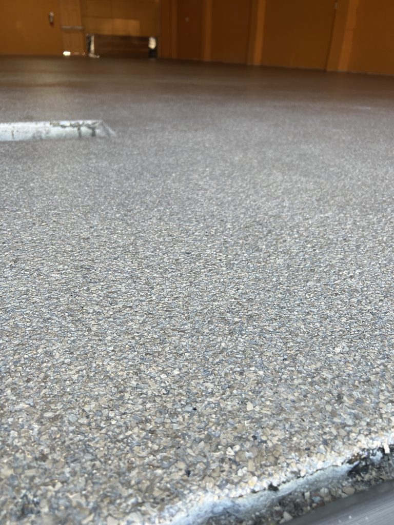 Work began with thorough mechanical surface preparation, including grinding and cleaning to remove old coatings, embedded contaminants, and weak surface material. Cracks and surface imperfections were carefully repaired to restore structural integrity and create a uniform base. Special attention was given to transitions, drains, and high-traffic zones to ensure long-term performance.