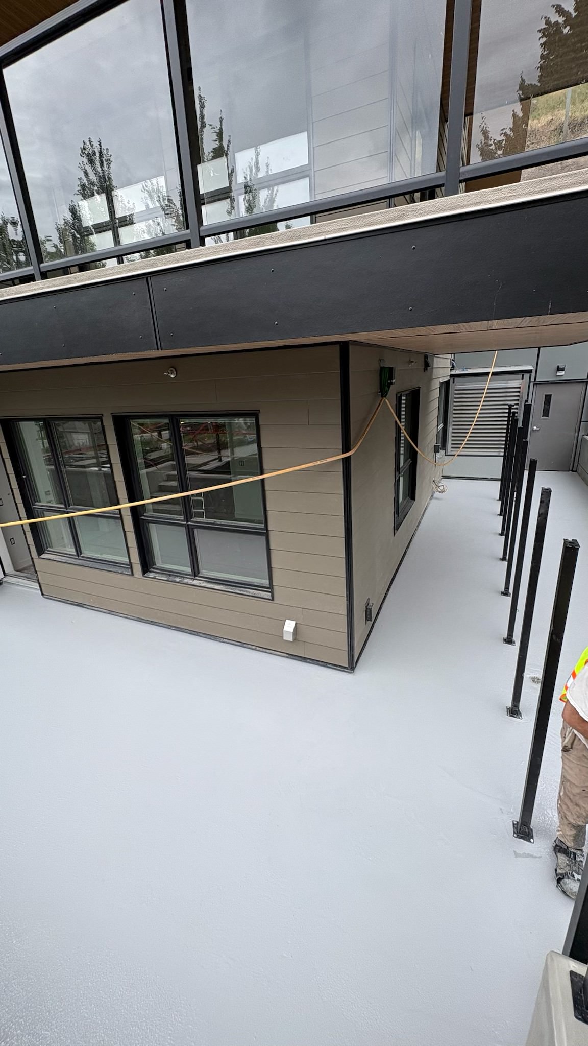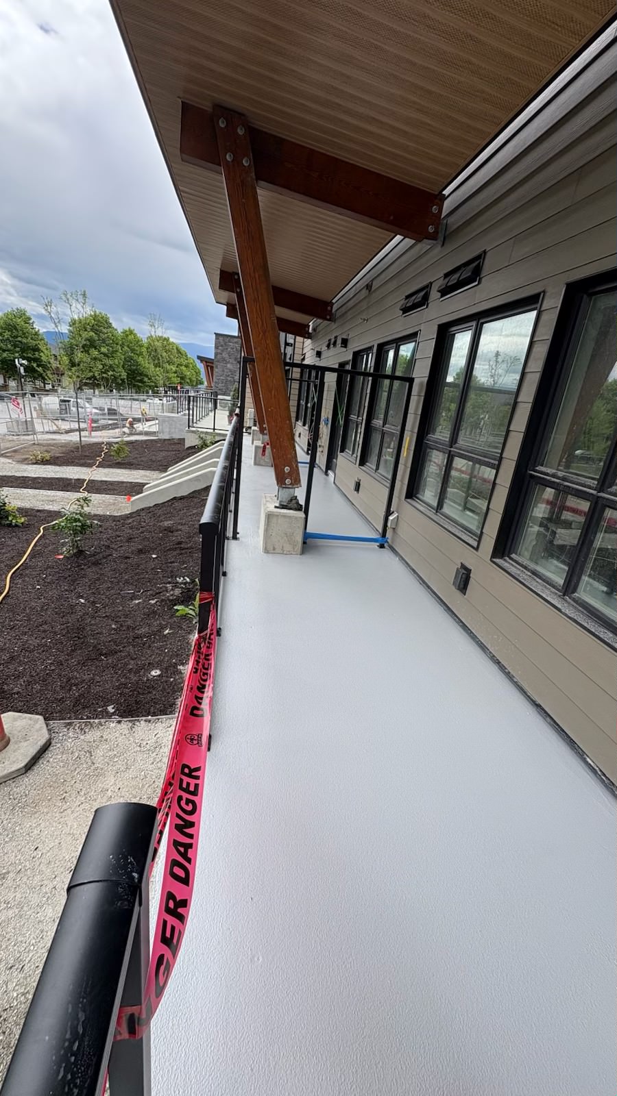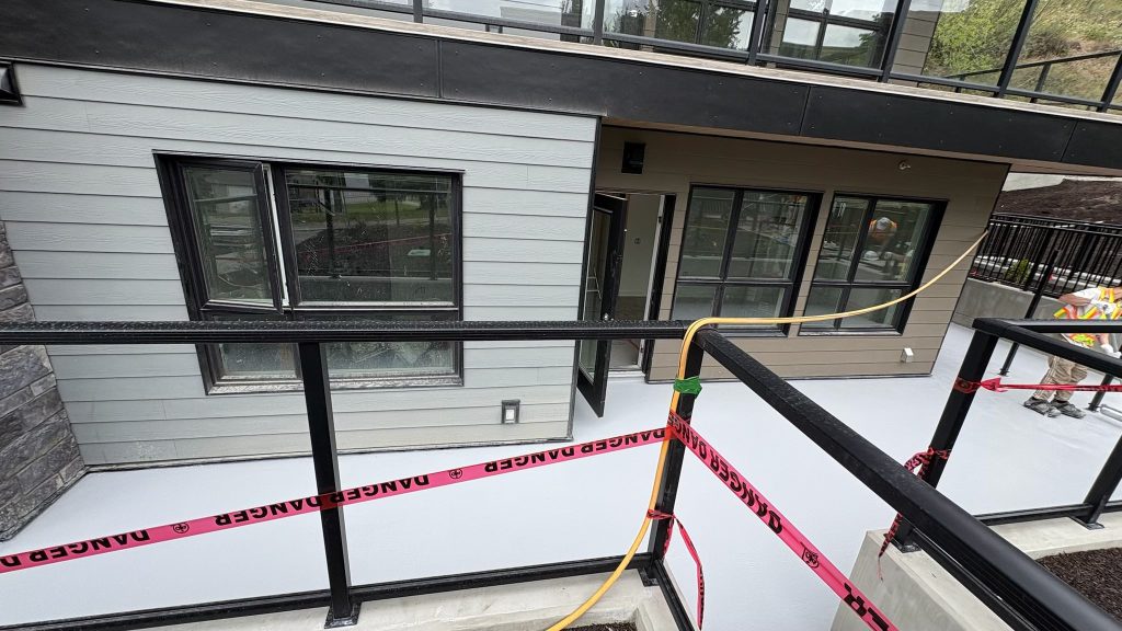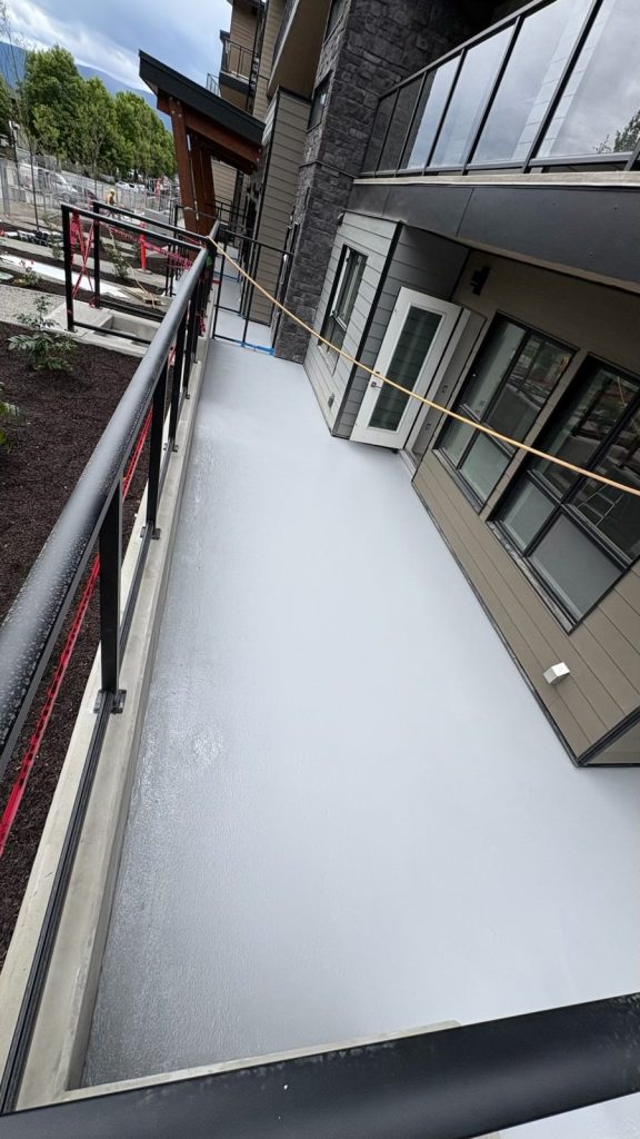 At this Kelowna residential development, our team installed a complete waterproofing and traffic coating system across the exterior walkways and ground-level balcony areas. These large outdoor platforms required a high-performance, slip-resistant finish capable of withstanding heavy foot traffic and the region’s diverse weather conditions.