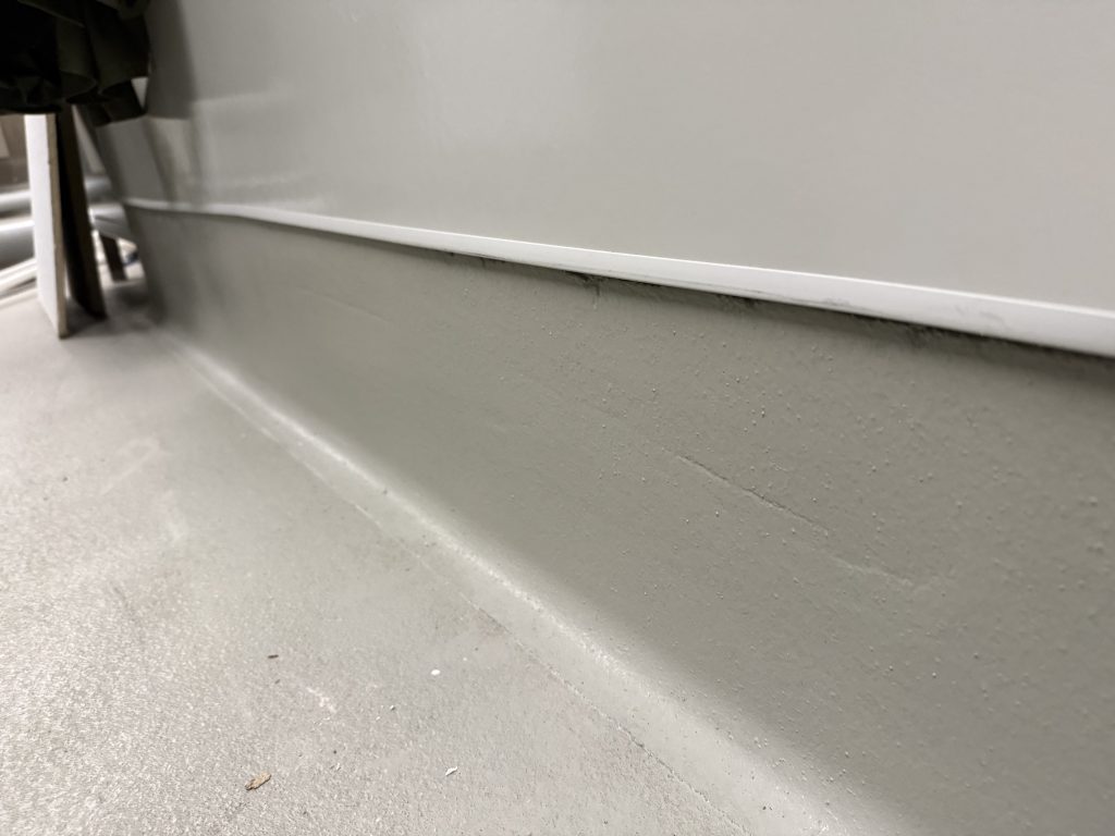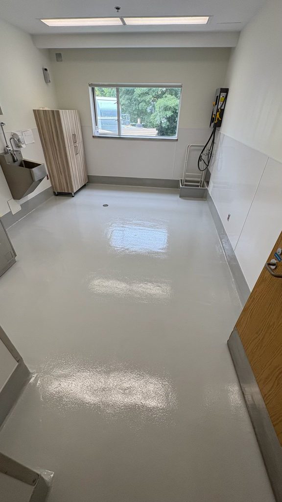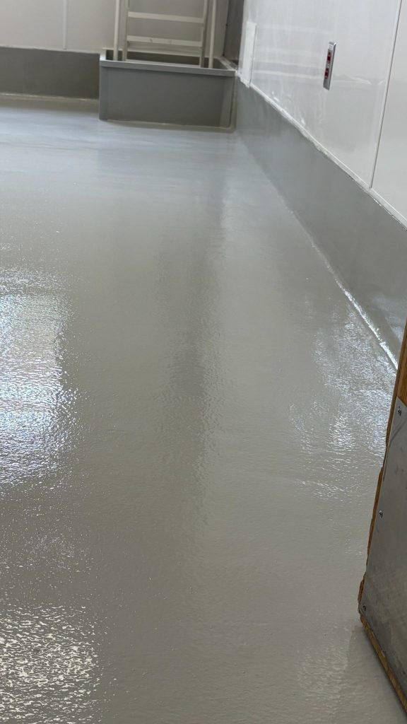 Work began with detailed surface preparation to ensure proper adhesion and long-term performance. The concrete substrate was mechanically prepared, cleaned, and primed to achieve a smooth, uniform base. A seamless epoxy coating was then applied across the floor area, including integrated cove bases at wall transitions to eliminate joints where bacteria and moisture can collect.