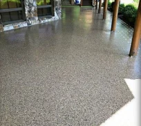 Full/Partial flake broadcast application (Decorative Flake broadcast Flooring System to provide Dense, stainresistant, Non-slippery, and durable surfaces in an extensive range of flake finishes and color options. Popular with design teams for applications from pharmacy labs to university concourses. Perfect for quick installations.) There are many different finishes and flake colors making a versatile option that can fit any aesthetic. The floors are extremely resistant to most chemicals. This application can be applied on all indoor and outdoor floors.